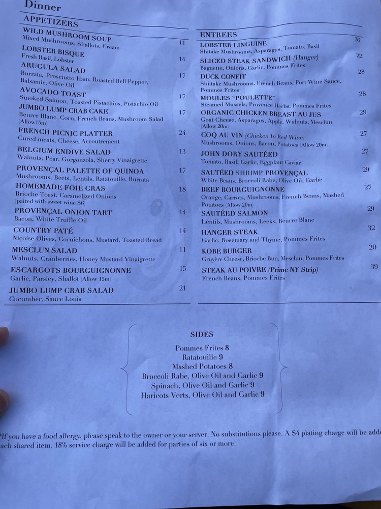 Le Provencal Bistro, a charming French restaurant in Mamaroneck, NY, offers a delightful dining experience with its romantic ambiance and classic dishes. The menu features a variety of options, including Foie Gras, chicken breast with goat cheese, steak frites, Beef Bourguignonne, Lobster Bisque, French Onion Soup, Seafood Risotto, Crème Brûlée, and more. Customers rave about the quality of food, from the perfectly prepared dishes to the light and refreshing cocktails. The attentive and friendly service adds to the overall enjoyable experience. With options for outdoor seating, catering, and takeout, Le Provencal Bistro caters to a wide range of preferences. Whether you're looking for a cozy dinner or a special brunch, this bistro is sure to impress with its elegant ambiance and delicious offerings.